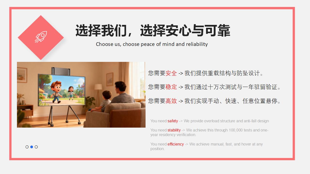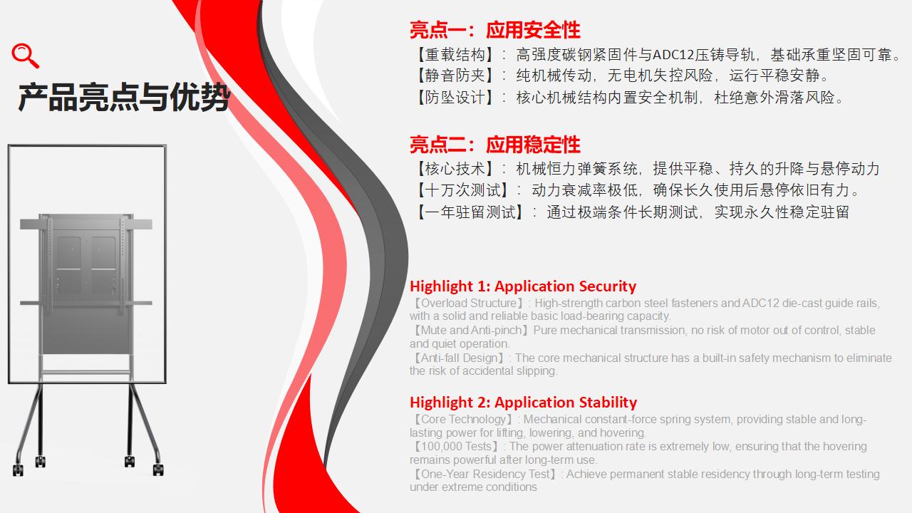 悬停升降支架是用于悬挂大型显示设备或物件,使其自由升降、稳定悬停在垂直移动行程范围内任意位置的一种机械平衡装置。通过精密弹簧的线性形变与导轨线性施力,提供均匀、顺滑的支撑平衡力。针对商业显示和办公设备,弹簧恒力技术带来极致顺滑的升降悬停体验,适应最佳应用体验,提升工作效率。