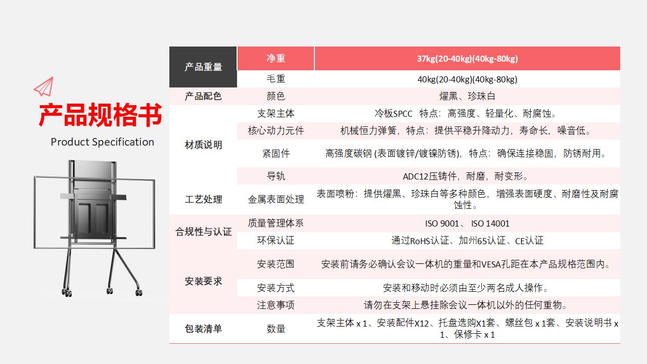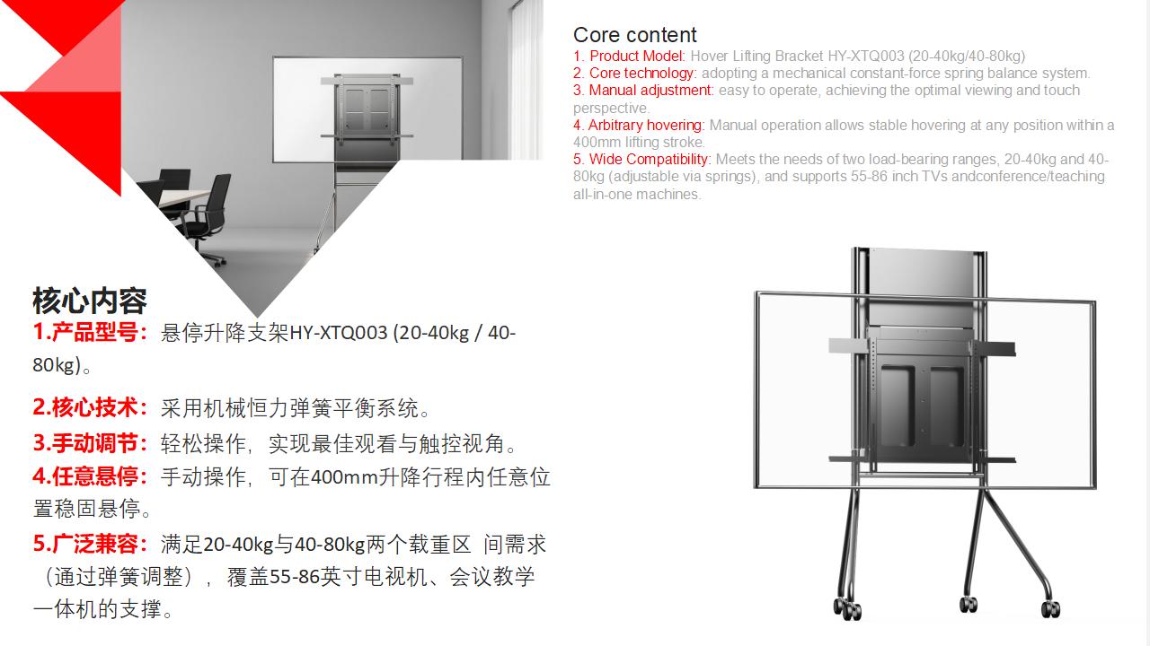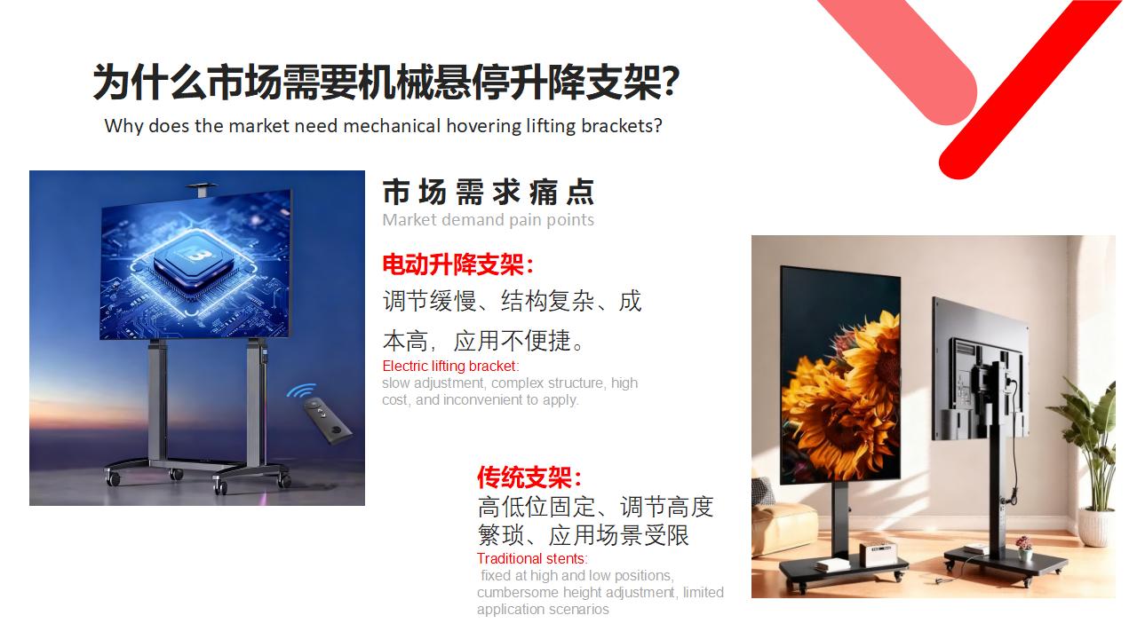 悬停升降支架是用于悬挂大型显示设备或物件,使其自由升降、稳定悬停在垂直移动行程范围内任意位置的一种机械平衡装置。通过精密弹簧的线性形变与导轨线性施力,提供均匀、顺滑的支撑平衡力。针对商业显示和办公设备,弹簧恒力技术带来极致顺滑的升降悬停体验,适应最佳应用体验,提升工作效率。